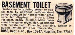 How could I NOT add another toilet ad? This one defies gravity by flushing up. I want one for my game room!
